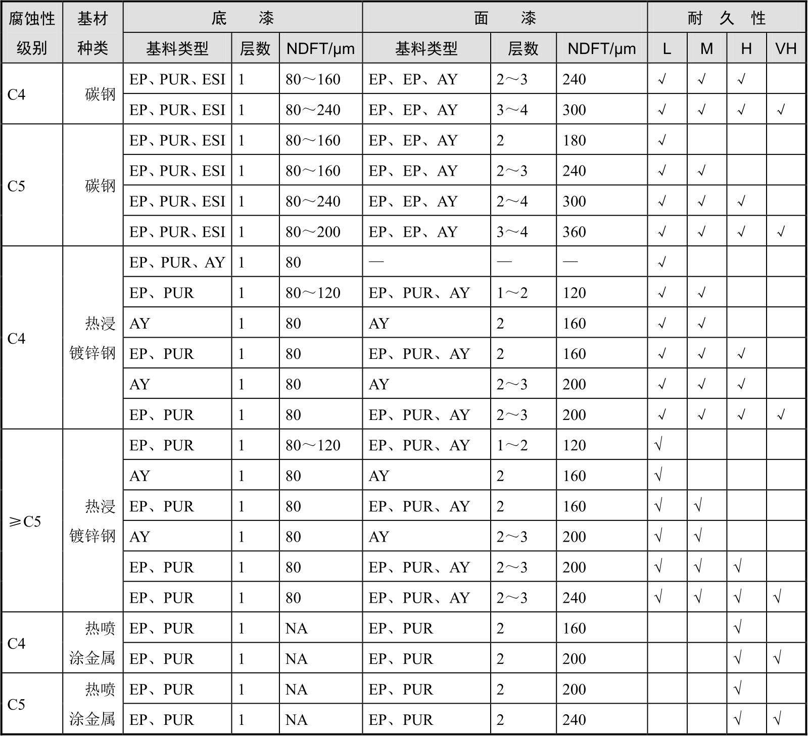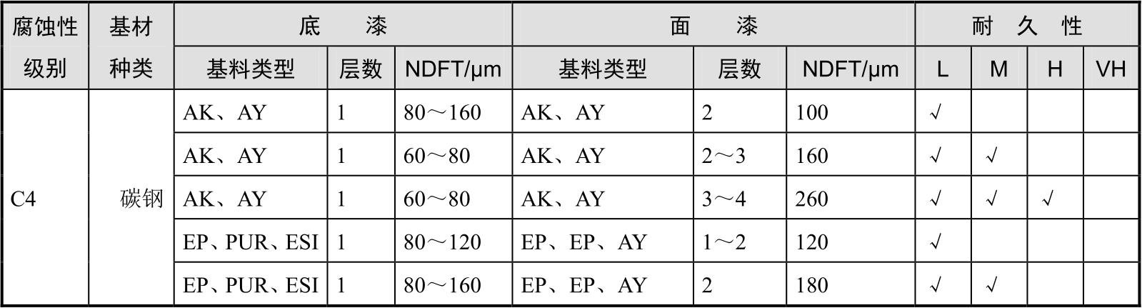 防护涂层的耐久性在ISO 12944—1:2017中划分为4个等级,不同的耐久性等级选用的配套体系有所不同。