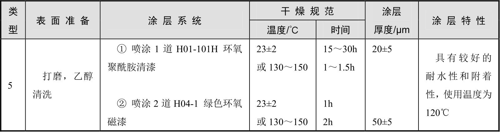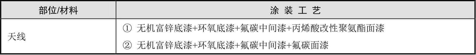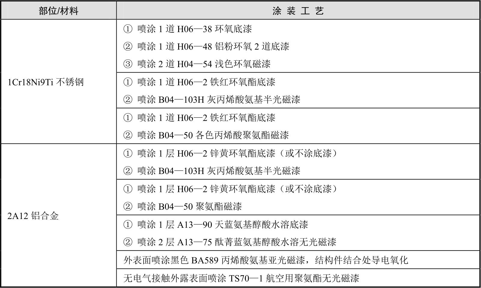 根据金属基材具体应用部位在实际服役过程中所处的环境特点,可选取合适的涂装工艺方法和步骤,以达到特定的屏蔽或防护效果。以应用于天线伺服系统和机箱机柜的材料及涂装工艺为例,列举了典型的涂装工艺,如表2-24和表2-25所示。