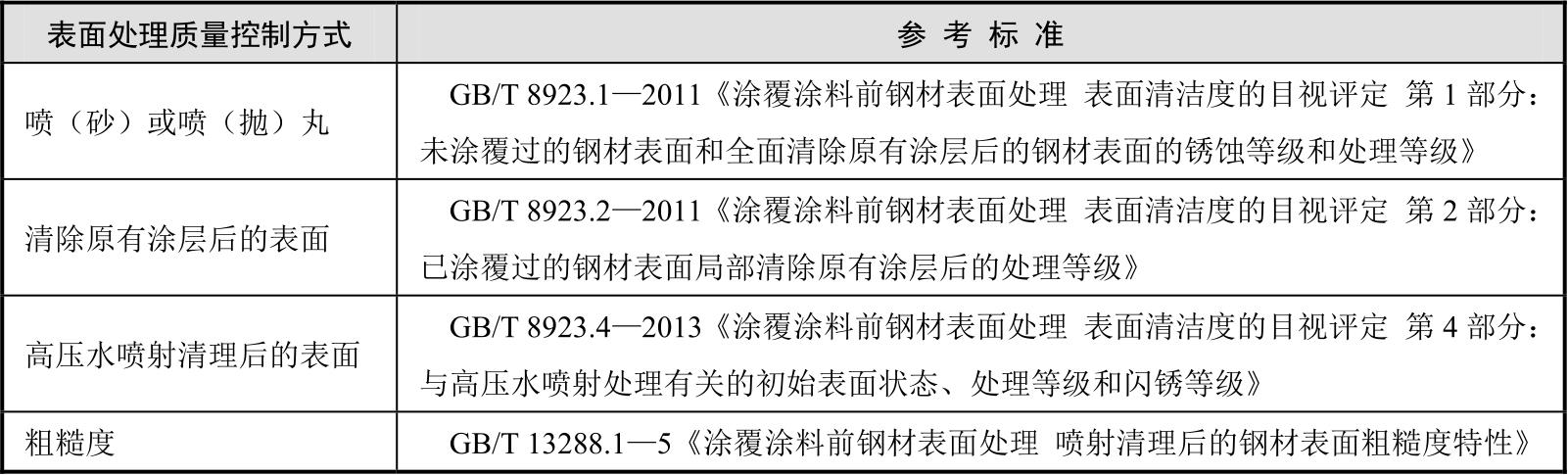 涂漆前必须严格按要求进行表面预处理。表面的任何油污、水分、锈迹或其他杂质,都会影响涂层的附着力和底漆的防锈效果。所以,要求去污、除油处理必须达到水膜连续(当水滴到上面时,不得形成水珠,而是一个连续附着的水膜)的水平;经阳极化、化学氧化或磷化处理的零件必须在24h内涂漆,经喷砂处理的零件必须在6h内涂漆,以防水汽的附着或二次污染 [26] 。例如,对复合材料的预处理通常选择阳极氧化、磷化、偶联剂处理等方式进行。未进行表面处理的工件,采用砂布横竖交叉打磨,直至基材表面有明显的纹路。一般选用水基清洗剂或有机溶剂进行清洗操作。清洗剂应为中性或弱碱性,在基材表面停留3~5min后用洁净的水清洗干净;有机溶剂选用航空洗涤汽油或丙酮,在汽油或丙酮还未挥发时用无布毛的白布擦干,避免有机溶剂中的高沸点油状物再次污染基材。以水膜连续30s为合格判据,对水基清洗剂清洗后的表面还要用pH试纸检测其表面酸碱性,中性为合格。禁止赤手触摸预处理清洗后的表面。表2-29列举了一些常见的表面预处理质量控制方法及参考标准。