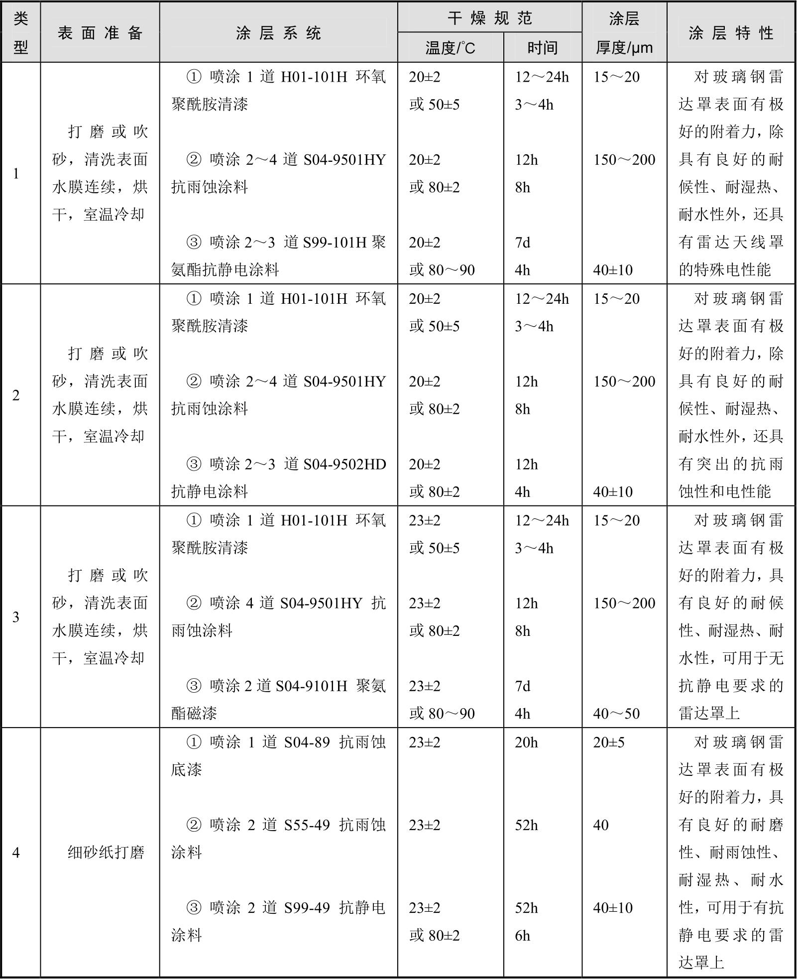 根据复合材料具体应用部位在实际服役过程中所处的环境特点,可选取合适的涂装工艺方法和步骤,以达到特定的功效。以应用于波导组件雷达罩上的复合材料表面涂装工艺为例,列举了典型的表面涂装工艺过程,雷达罩涂装工艺如表2-26所示。