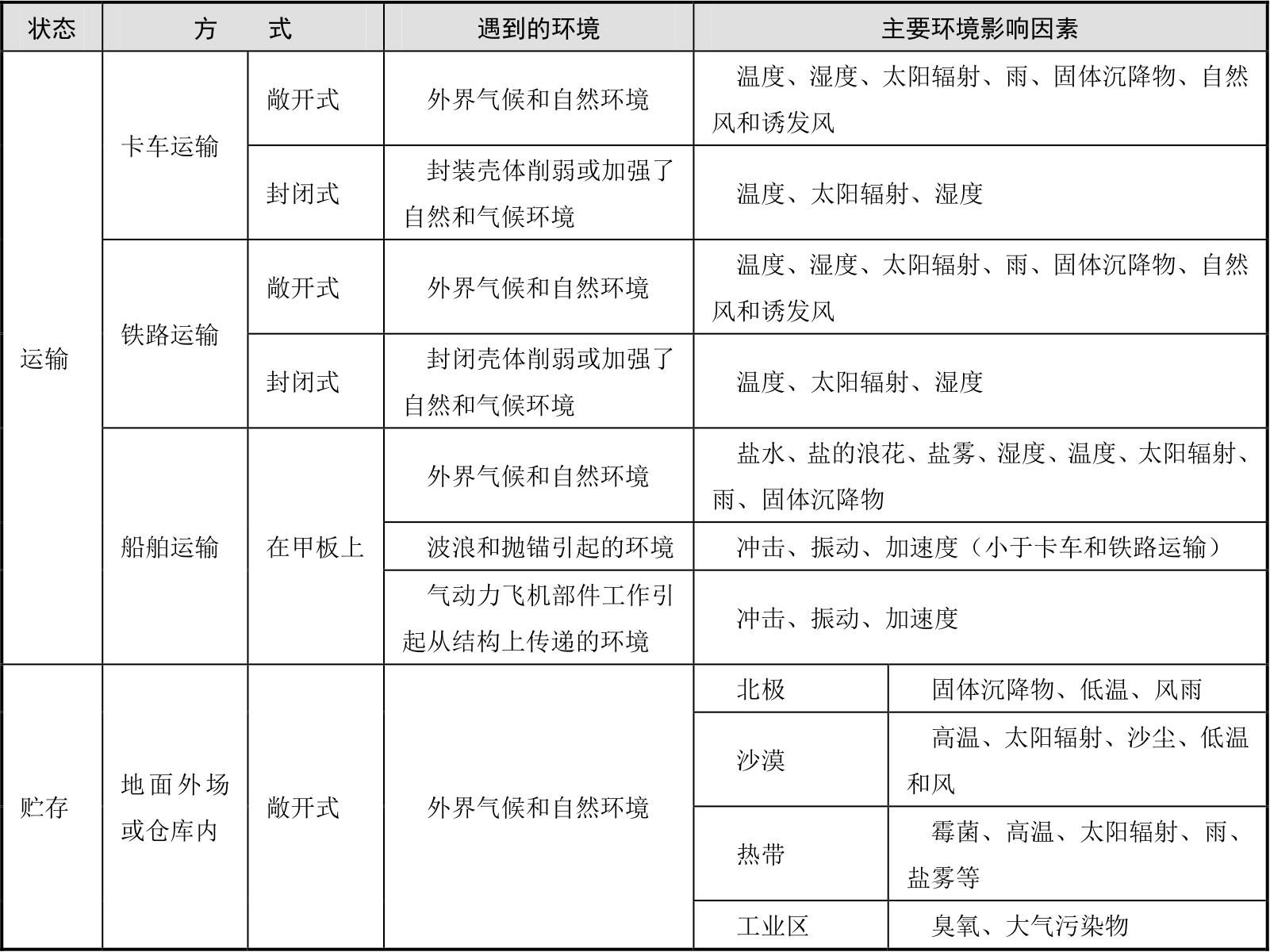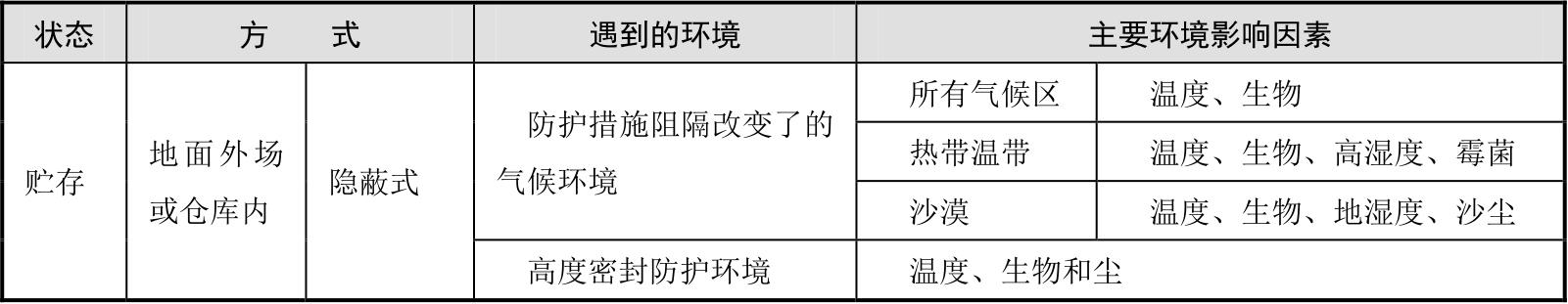 表3-2 装备在运输和贮存阶段遇到的环境和主要环境影响因素(涂层相关)