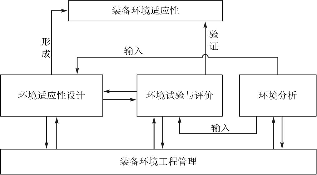 环境试验作为装备环境工程工作的组成部分并不是独立存在的,而是与环境工程管理、环境分析、环境适应性设计等其他部分密切联系的,如图3-2所示。