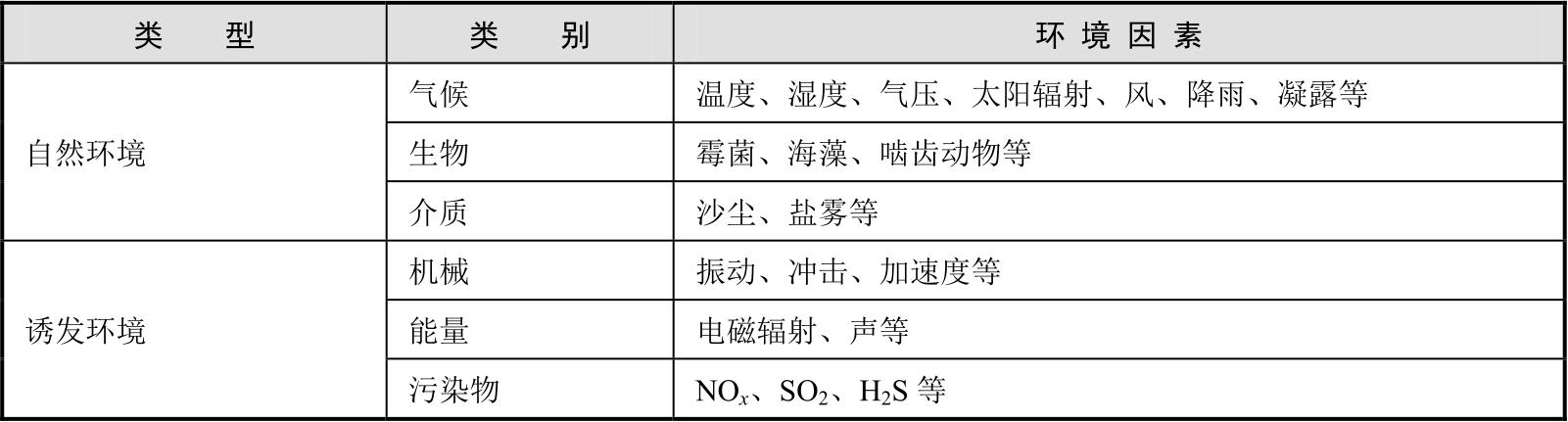 GJB 6117—2007中对环境的定义为“装备在任何时间或地点所存在的或遇到的自然和诱发的环境因素的综合”,环境因素分类及组成如表3-1所示。