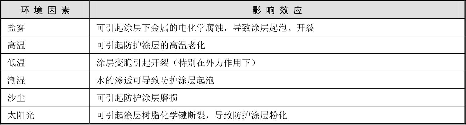 表3-3 典型环境因素对防护涂层的影响效应