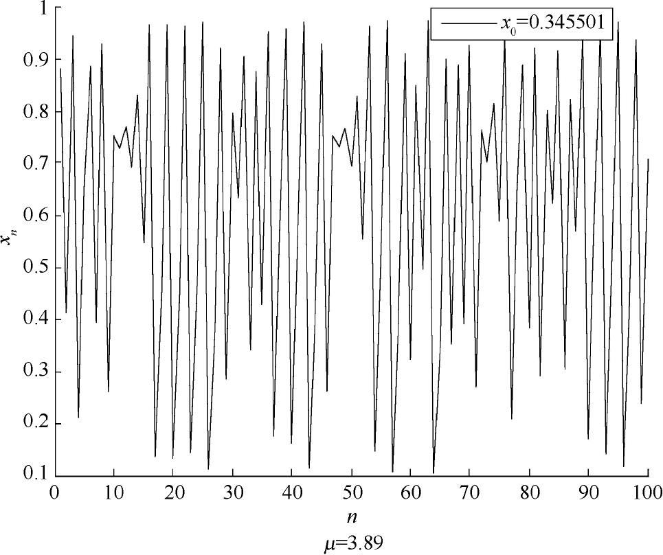 混沌运动在时域上表现为随机运动现象,以著名的Logistic混沌映射为例,该映射在 μ >3.56995时处于混沌运动状态。当参数 μ 取值为3.89时,其映射函数可表示为