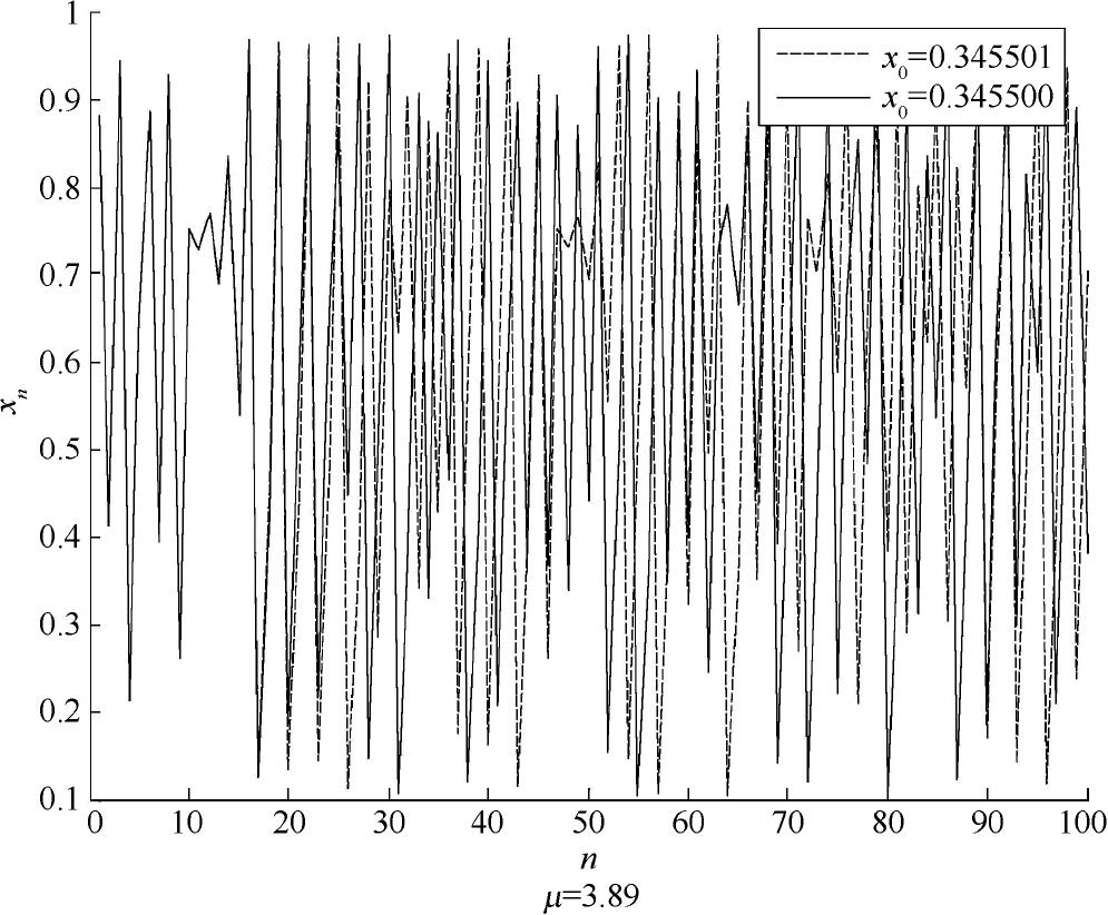 图1.1为初值 x 0 =0.345501的时域图,从图中可以看到,混沌在时域上表现为一种非周期的运动,这种非周期性可以看作一种伪随机运动。