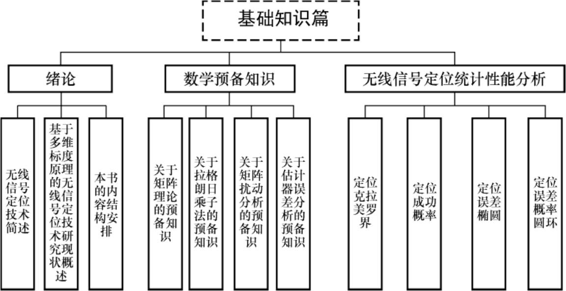 第1部分由第1~3章构成。第1章对无线信号定位技术进行了简述,并对基于多维标度原理的无线信号定位技术的研究现状进行了概述。第2章介绍了全书涉及的数学预备知识,其中包括矩阵理论、拉格朗日乘子法、矩阵扰动分析及估计器误差分析中的若干预备知识,可作为全书的数学基础。第3章给出了衡量无线信号定位统计性能的若干指标,并给出相应的理论计算公式,从而为本书各章定位方法的性能提供理论依据。全书第1部分的结构示意图如图1.1所示。