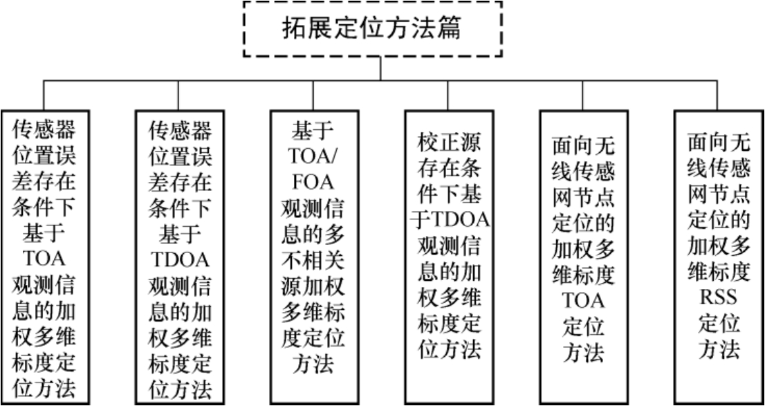 第3部分由第9~14章构成,将第2部分给出的定位方法进行了拓展,分别包括传感器位置误差存在条件下基于TOA观测信息的加权多维标度定位方法、传感器位置误差存在条件下基于TDOA观测信息的加权多维标度定位方法、基于TOA/FOA观测信息的多不相关源加权多维标度定位方法(多辐射源协同定位)、校正源存在条件下基于TDOA观测信息的加权多维标度定位方法、面向无线传感网节点定位的加权多维标度TOA定位方法(多源节点协同定位)及面向无线传感网节点定位的加权多维标度RSS定位方法(多源节点协同定位)。全书第3部分的结构示意图如图1.3所示。