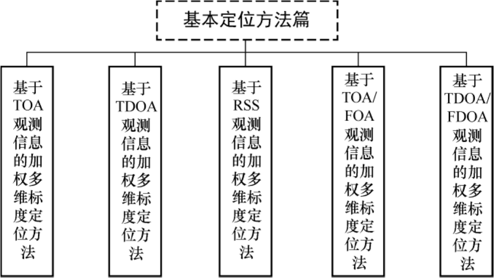 第2部分由第4~8章构成,针对不同的定位观测量,描述了基本的加权多维标度定位方法,分别包括基于TOA观测信息的加权多维标度定位方法、基于TDOA观测信息的加权多维标度定位方法、基于RSS观测信息的加权多维标度定位方法、基于TOA/FOA观测信息的加权多维标度定位方法及基于TDOA/FDOA观测信息的加权多维标度定位方法。全书第2部分的结构示意图如图1.2所示。