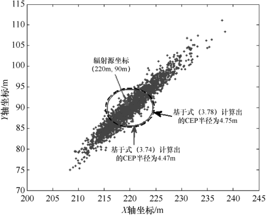 本节将介绍定位误差概率圆环(Circular Error Probable,CEP)的基本概念,这是一种相对粗糙但简单的刻画定位精度的度量标准。误差概率圆环定义了一个圆,其圆心位于估计值的均值(对于无偏估计而言就是辐射源的真实位置),圆半径的选取原则是保证估计值以概率0.5落入圆内。