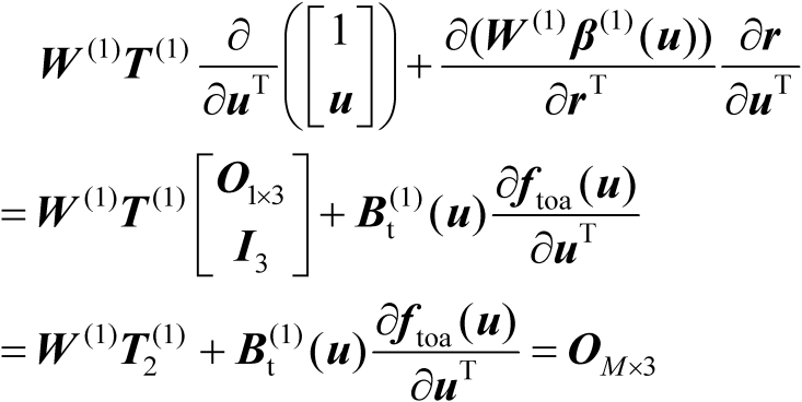 需要指出的是,式(4.15)并不是最终的关系式,为了得到用于定位的关系式,还需要将式(4.15)两边左乘以
