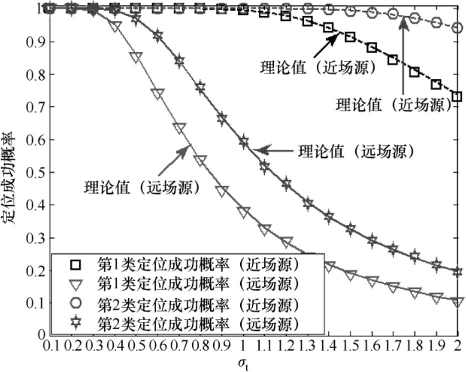 从图4.4~图4.7可以看出:(1)基于加权多维标度定位方法1的辐射源位置估计均方根误差可以达到克拉美罗界(见图4.4和图4.6),这验证了4.2.4节理论性能分析的有效性;(2)随着辐射源与传感器距离的增加,其定位精度会逐渐降低(见图4.6和图4.7),其对近场源的定位精度要高于对远场源的定位精度(见图4.4和图4.5);(3)两类定位成功概率的理论值和仿真值相互吻合,并且在相同条件下第2类定位成功概率高于第1类定位成功概率(见图4.5和图4.7),这验证了3.2节理论性能分析的有效性。