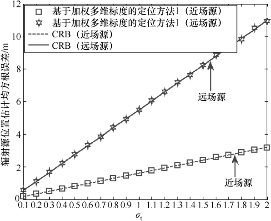 图4.4 辐射源位置估计均方根误差随着标准差 σ t 的变化曲线