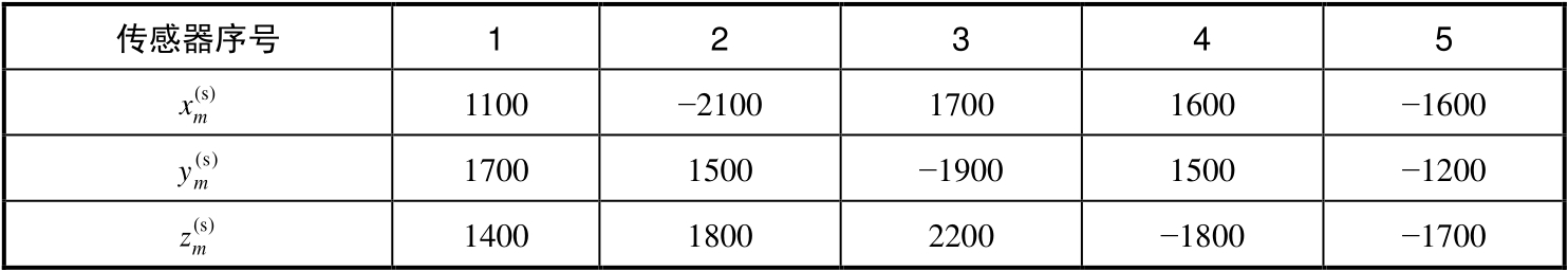 假设利用5个传感器获得的TOA信息(也即距离信息)对辐射源进行定位,传感器三维位置坐标如表4.1所示,距离观测误差