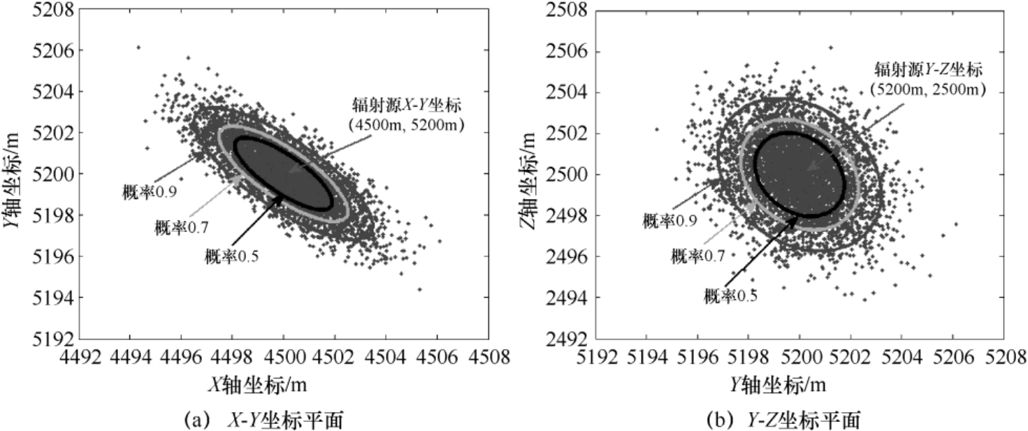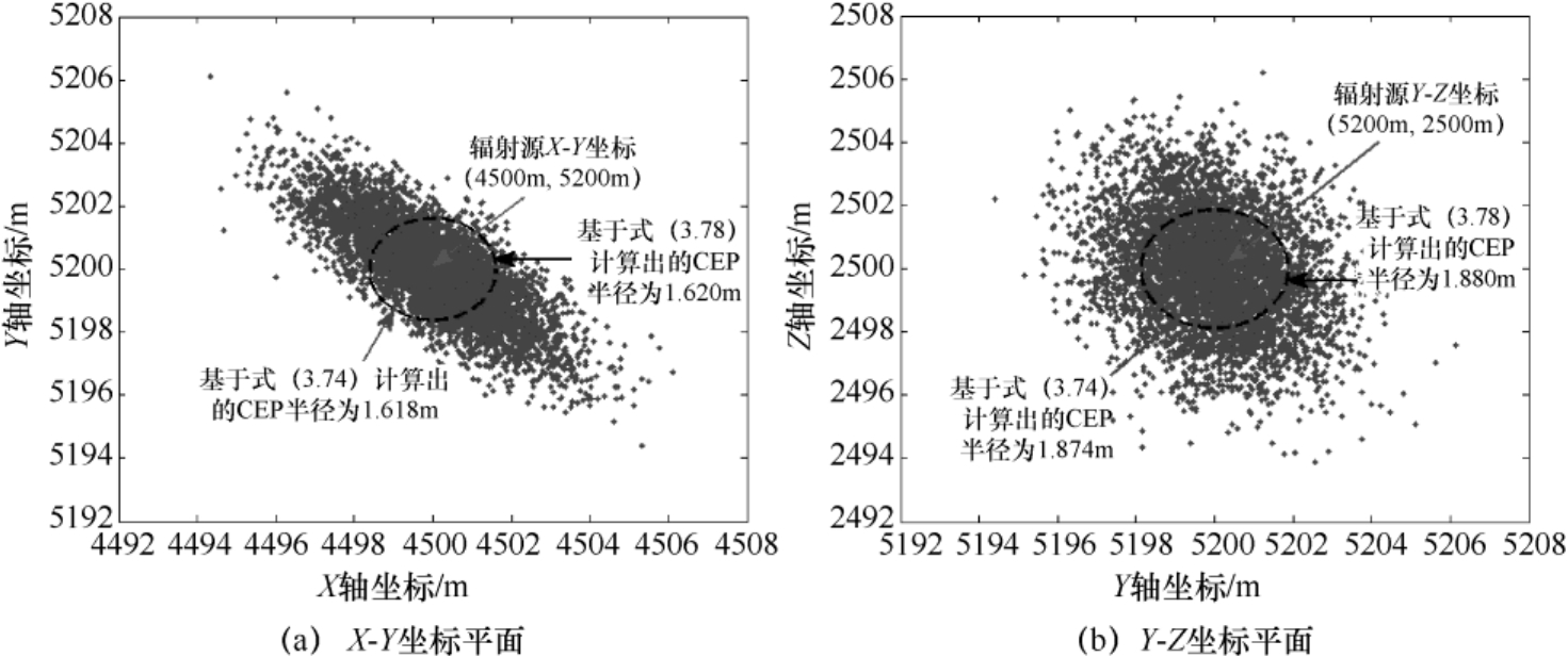 ,图4.2给出了定位结果散布图与定位误差椭圆曲线;图4.3给出了定位结果散布图与误差概率圆环曲线。