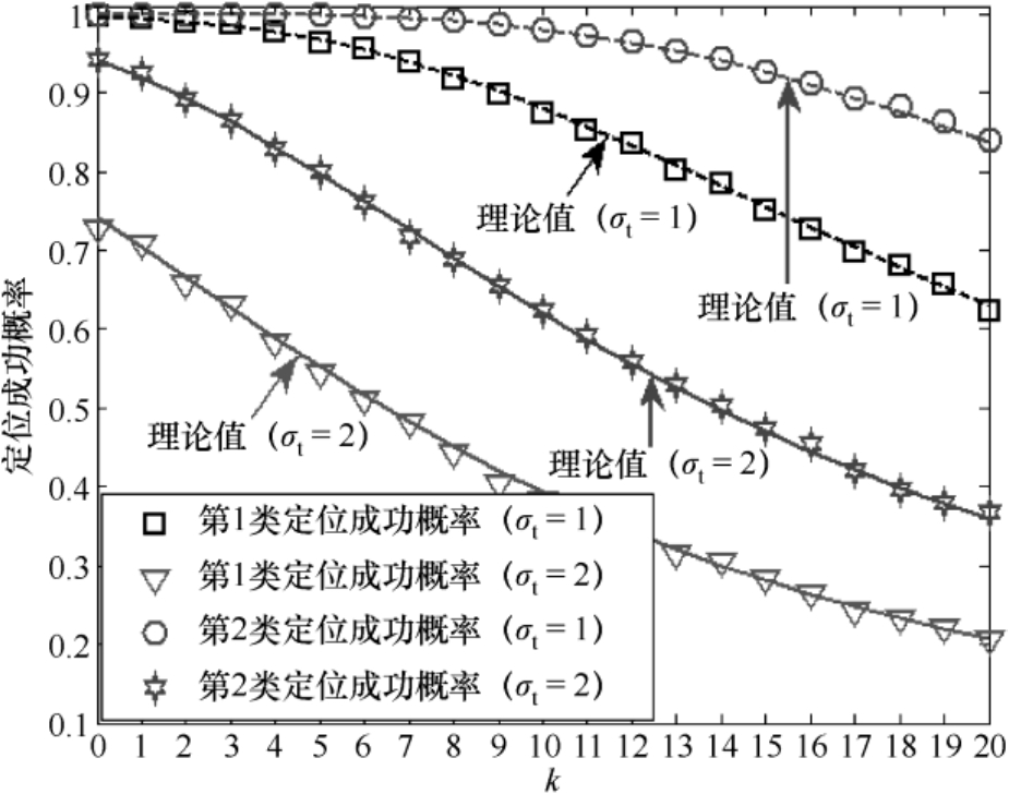图4.5 辐射源定位成功概率随着标准差 σ t 的变化曲线