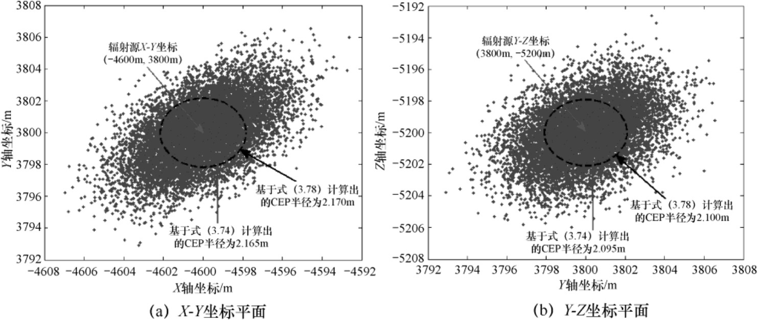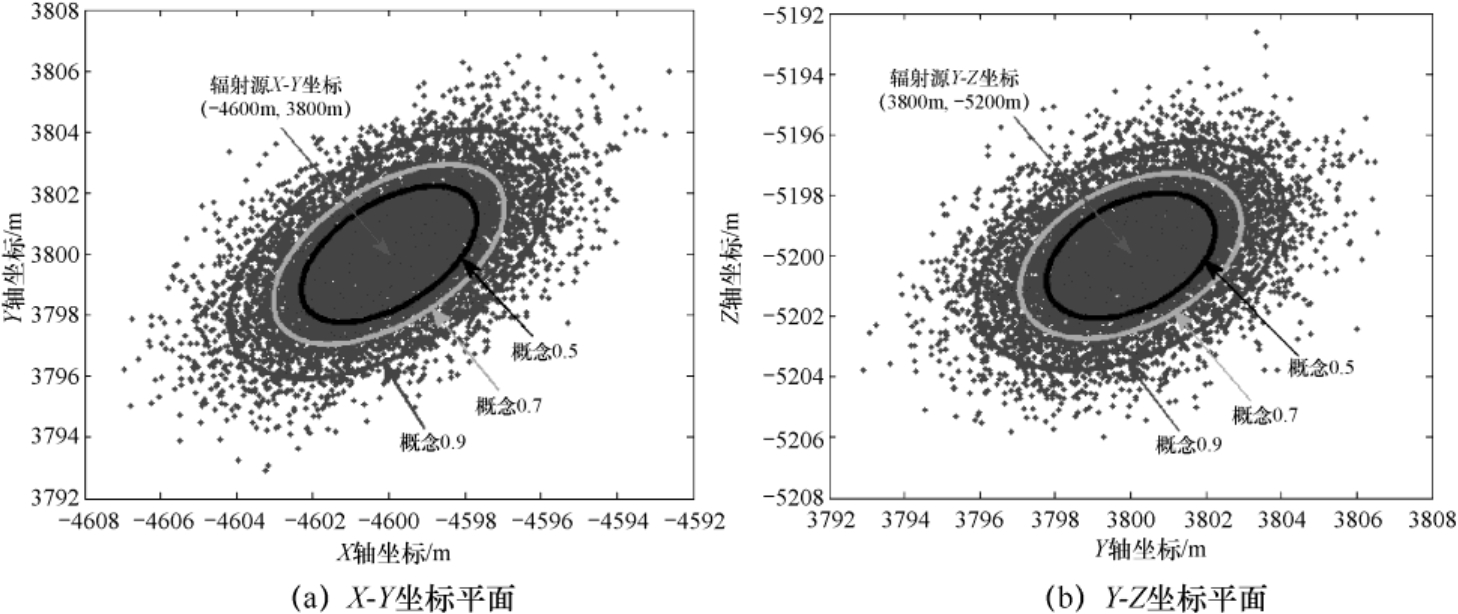 假设利用6个传感器获得的TOA信息(也即距离信息)对辐射源进行定位,传感器三维位置坐标如表4.2所示,距离观测误差 服从均值为零、协方差矩阵为 的高斯分布。