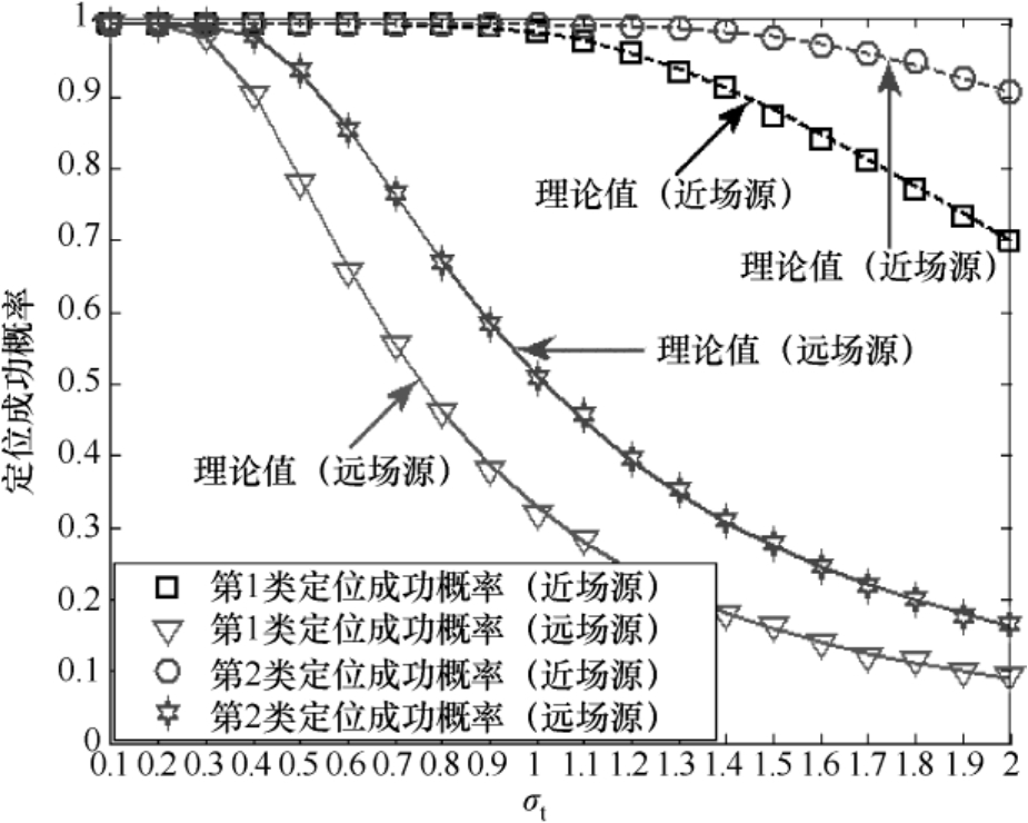 然后将辐射源坐标设为两种情形:第1种是近场源,其位置向量为 (m);第2种是远场源,其位置向量为 (m)。改变标准差 的数值,图4.11给出了辐射源位置估计均方根误差随着标准差 的变化曲线;图4.12给出了辐射源定位成功概率随着标准差 的变化曲线(图中的理论值是根据式(3.29)和式(3.36)计算得出的,其中 m)。