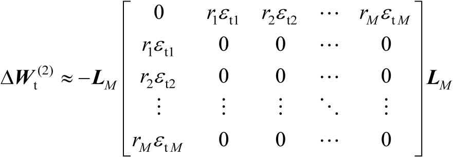 式中, 表示 中的误差矩阵,即有 。若忽略观测误差 的二阶及其以上各阶项,根据式(4.55)可以将误差矩阵 近似表示为