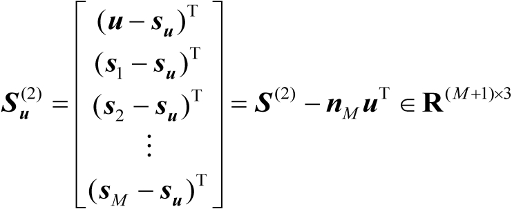 在实际定位过程中,标量积矩阵 的真实值是未知的,因为其中的真实距离 仅能用其观测值 来代替,这必然会引入观测误差。不妨将含有观测误差的标量积矩阵 记为 ,于是利用式(4.46)和式(4.47)可知,矩阵 可以表示为