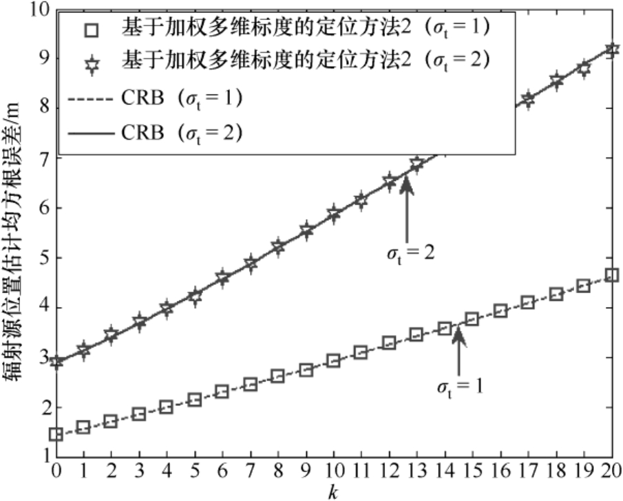 图4.11 辐射源位置估计均方根误差随着标准差 σ t 的变化曲线