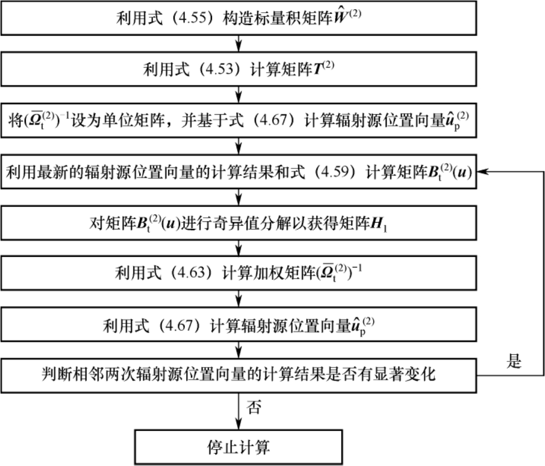 【注记4.6】 由式(4.60)、式(4.61)及式(4.63)可知,加权矩阵 与辐射源位置向量 有关。因此,严格来说,式(4.66)中的目标函数并不是关于向量 的二次函数,针对该问题,可以采用注记4.1中描述的方法进行处理。理论分析表明,在一阶误差分析理论框架下,加权矩阵 中的扰动误差并不会实质影响估计值 的统计性能。