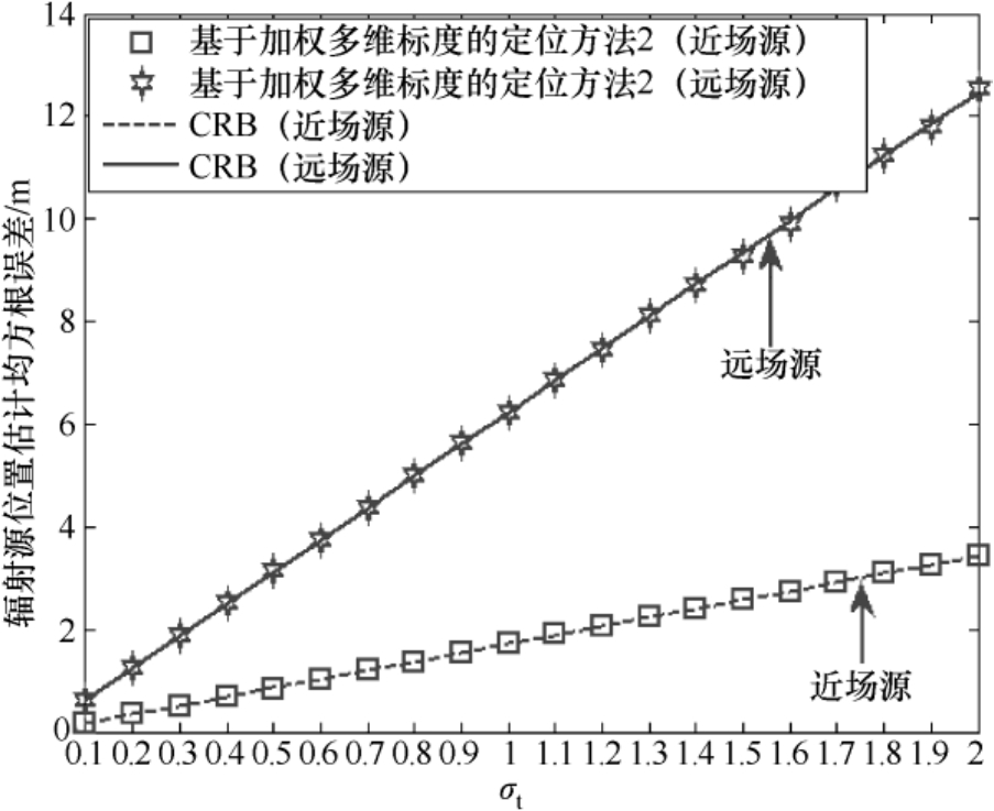 图4.11 辐射源位置估计均方根误差随着标准差 σ t 的变化曲线
