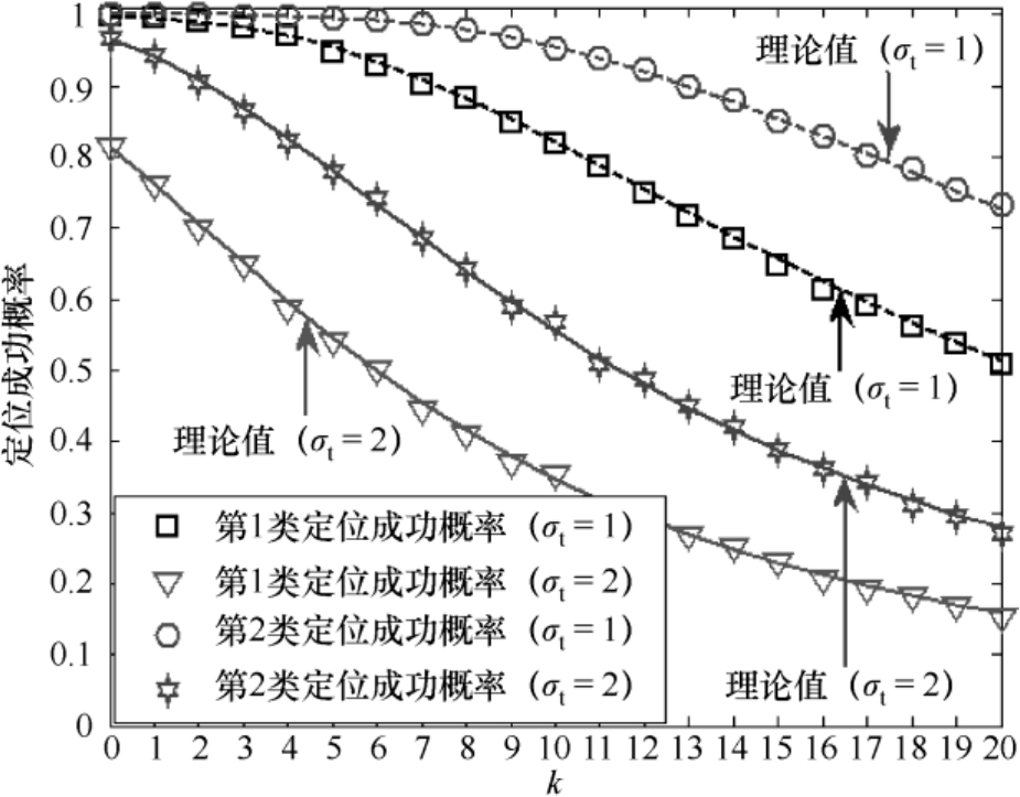 图4.12 辐射源定位成功概率随着标准差 σ t 的变化曲线
