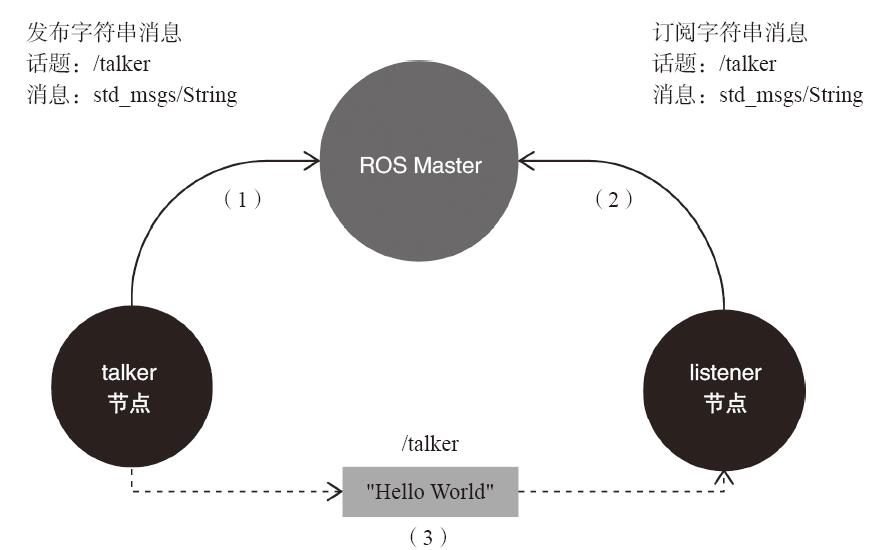 如图1.8所示,有两个节点分别名为talker和listener。talker节点将名为Hello World的字符串消息发布到名为/talker的话题中,而listener节点订阅此话题。整个过程包含了三个阶段,在图中分别标记为(1)、(2)和(3),让我们看看每个阶段发生了什么:
