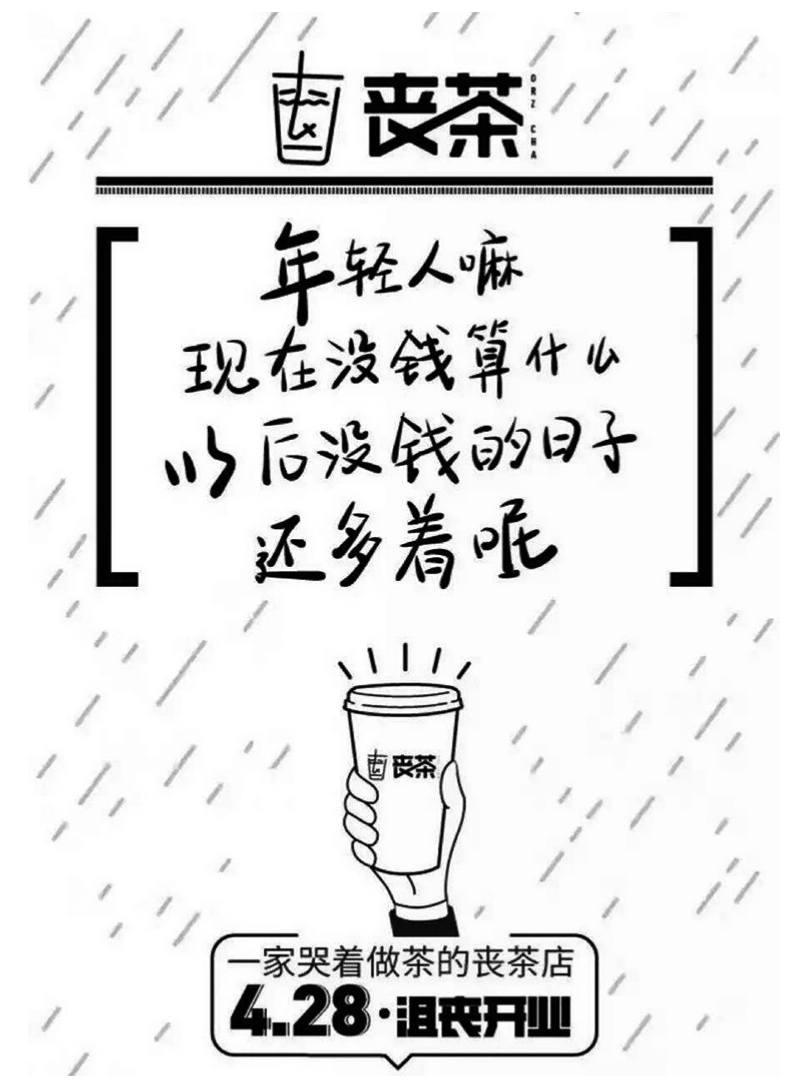 从“高能段子”到时尚快闪店,集中高频的品牌曝光,彼时丧茶的热度甚至一度超越大热的喜茶。身处新奇营销手段层出不穷的新茶饮行业,“江小白式”的暖心文案在茶饮业已并不鲜见,而丧茶则剑走偏风,在一众积极、向上调性的“鸡汤”中反向思考年轻人的生活日常。丧茶的特立独行,成就了“丧文案”的“奇”。同时,这种“奇”并没有脱离生活本质,恰恰相反,“丧文案”虽“奇”却不“怪”,它只是以另一种语言表达出了年轻人心底的声音。这样的丧茶,如何能不“吸引”年轻人呢?
