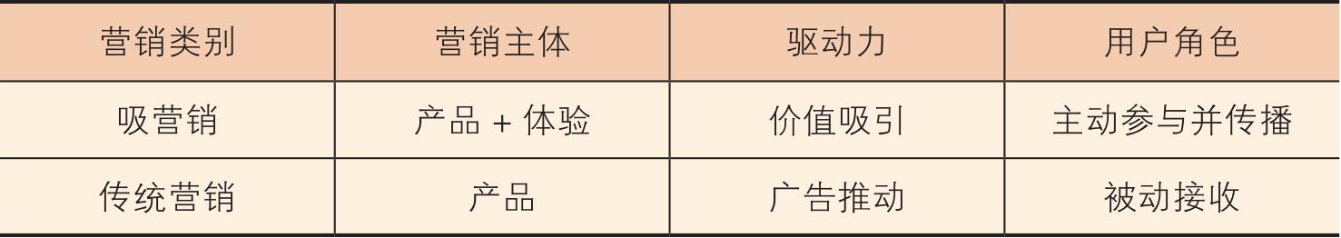 相较于传统的高成本、重广告的利益驱动式营销,当下的吸营销更侧重于“吸引力”的打造,以价值为驱动,其成果也往往与营销创意密切关联。那么,吸营销与传统营销到底有哪些不同呢?下面,我们通过营销主体、驱动力、用户角色三大维度来分析(见表2-1)。