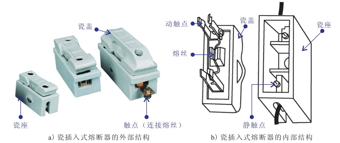 瓷插入式熔断器(RC1A系列)主要由瓷座、瓷盖、静触点、动触点和熔丝等组成,如图2-24所示,其中瓷盖和瓷底均用电工瓷制成,电源线和负载电源线分别接在瓷底两端的静触头上。瓷座中部还有一个空腔,与瓷盖的凸出部分组成灭弧室。