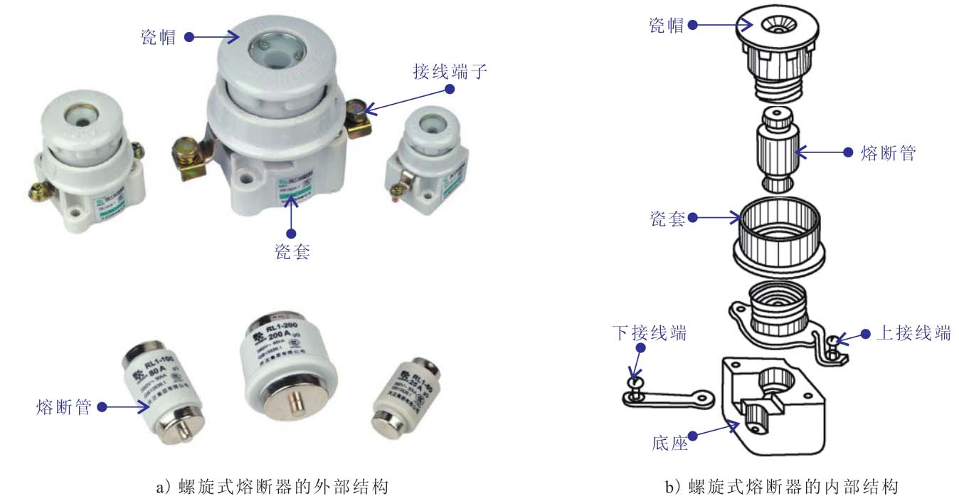 螺旋式熔断器主要由瓷帽、熔断管、上接线端、下接线端和底座等组成,如图2-25所示。其中,熔断管内装有熔丝以及石英砂,石英砂的作用是熄灭电弧。