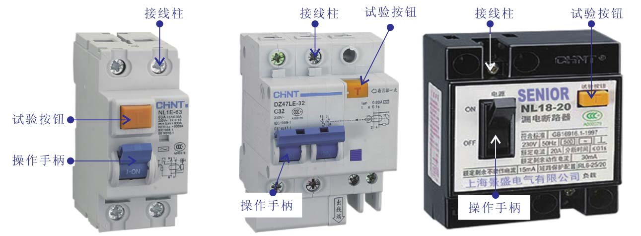 剩余电流保护器俗称漏电保护器,是一种具有漏电保护功能的断路器,是配电(照明)等电路中的基本组成部件,具有漏电、触电、过载、短路的保护功能,对防止触电伤亡事故的发生、避免因漏电而引起火灾,具有明显的效果。图2-33为典型剩余电流保护器的实物外形。