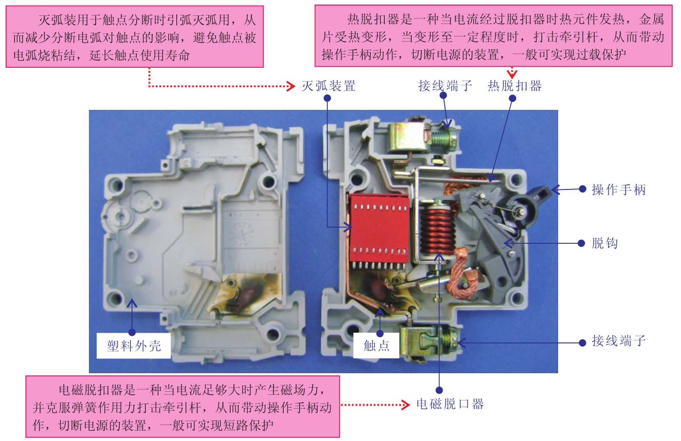 图2-32典型塑壳式断路器的内部结构组成。其主要是由塑料外壳、脱扣器装置、触点、接线端子、操作手柄等部分构成的。