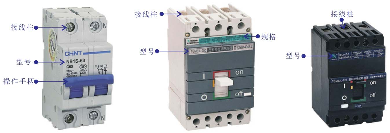 断路器是一种切断和接通负荷电路的器件,该器件具有过载自动断路保护的功能。根据其应用场合主要可分为低压断路器和高压断路器,图2-30为典型断路器的实物外形。