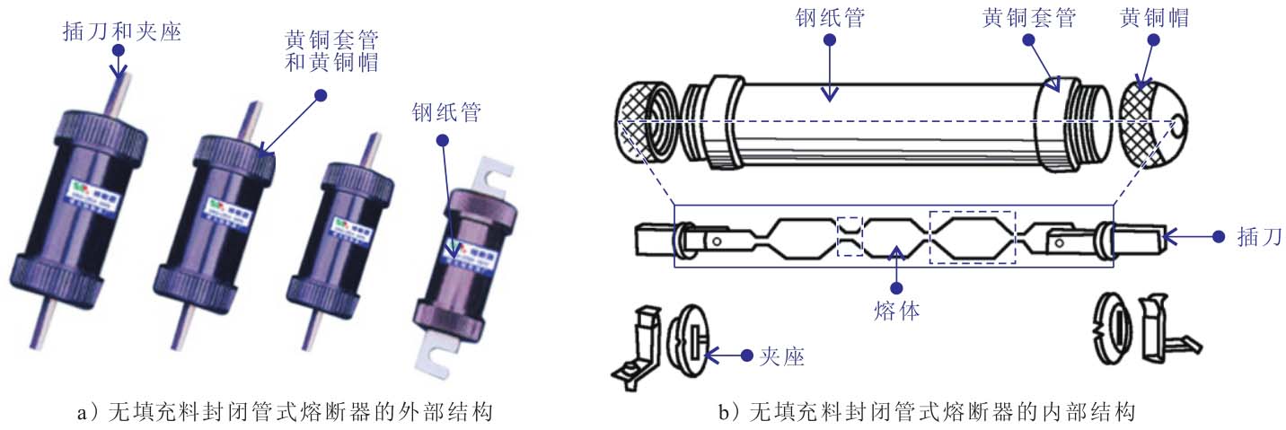 无填充料封闭管式熔断器的断流能力大、保护性好,因此常用于交流500V、直流400V,额定电流1000A以内的低压电路及成套配电设备中。