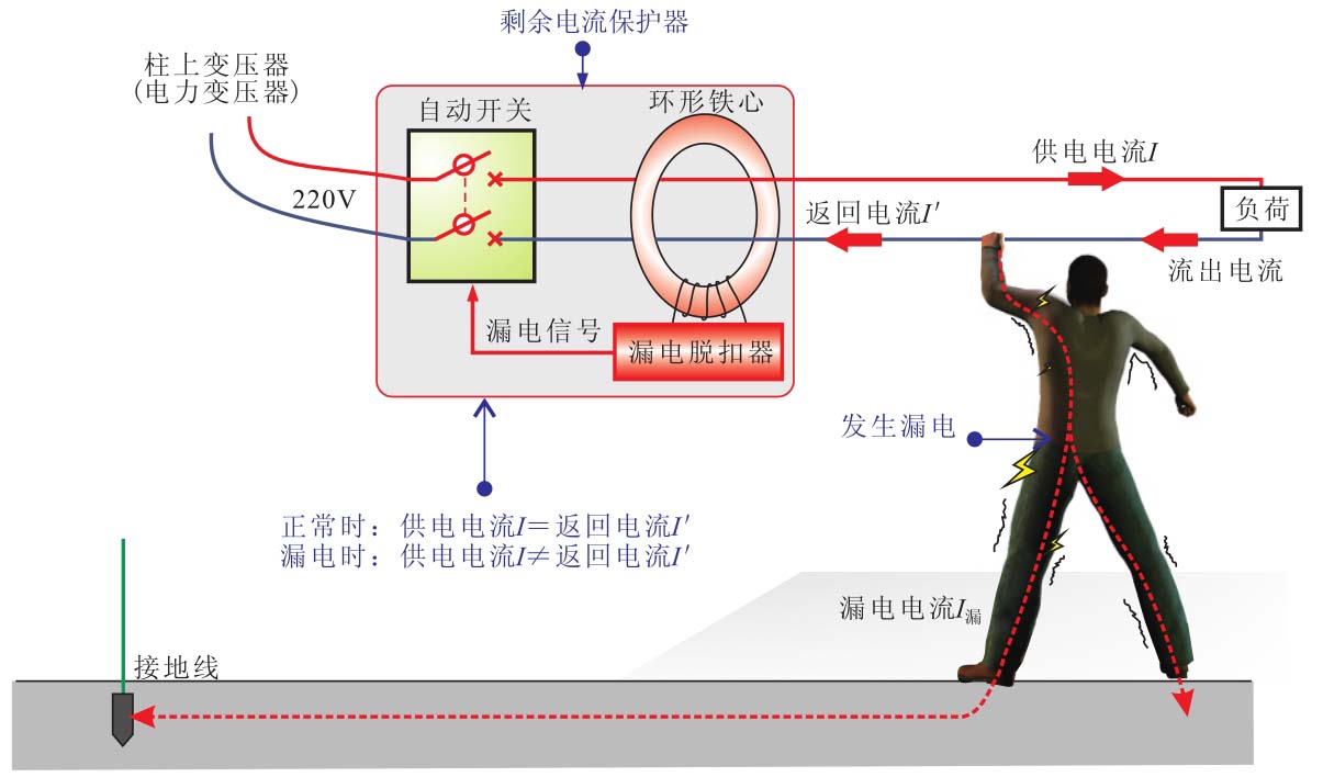 当被保护电路发生漏电或有人触电时,由于漏电电流的存在,使供电电流大于返回电流,通过环形铁心的两路电流向量和不再等于零,在铁心中出现了交变磁通。在交变磁通的作用下,检测元件的输出端就有感应电流产生,当达到额定值时,脱扣器驱动断路器自动跳闸,切断故障电路,从而实现保护。