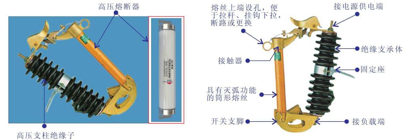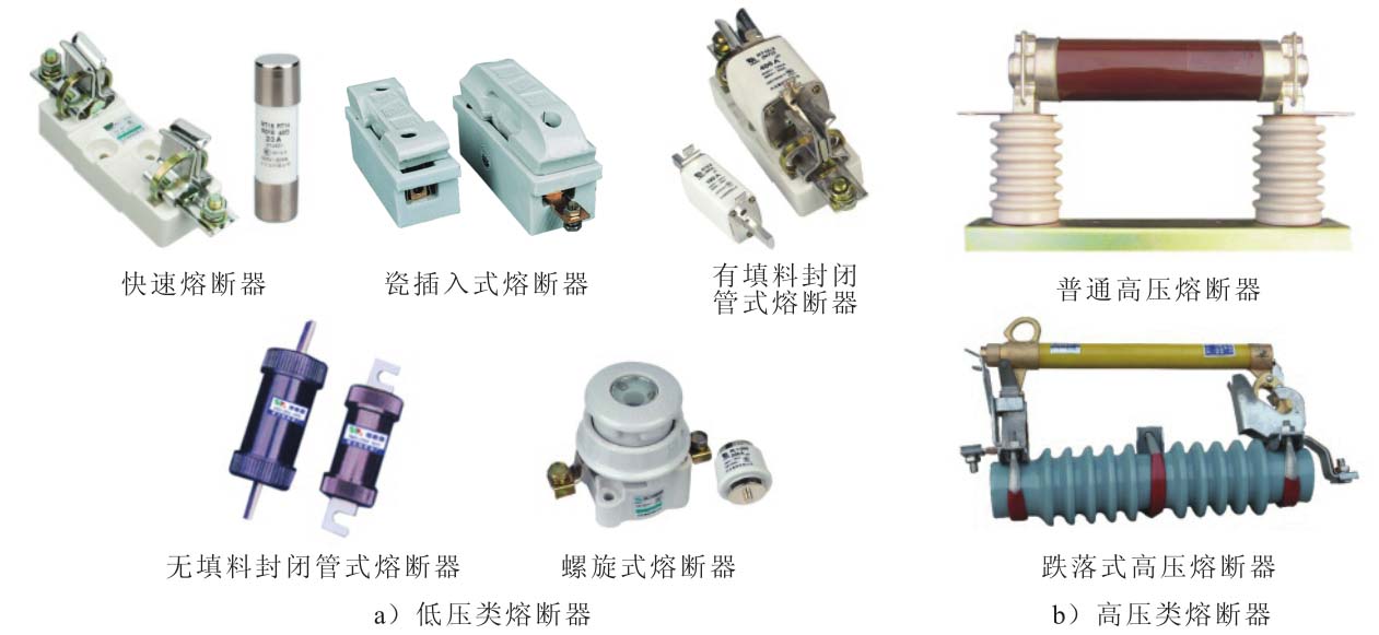 根据应用场合,熔断器有高低压之分。常用的低压熔断器有瓷插入式熔断器、螺旋式熔断器、无填料封闭管式熔断器和有填料封闭管式熔断器几种;高压熔断器主要有普通高压熔断器、跌落式熔断器等,如图2-23所示。