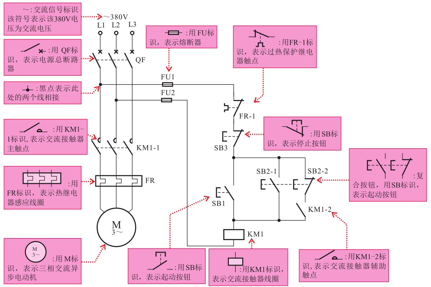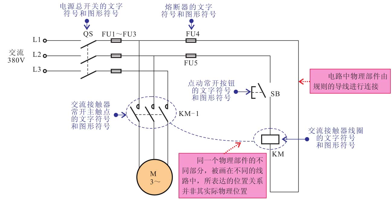 从图中可以看出,电工原理图的特点是使用文字符号和图形符号来体现系统中所使用的基本电气部件,并使用规则的导线进行连接,其具体功能及特点如下: