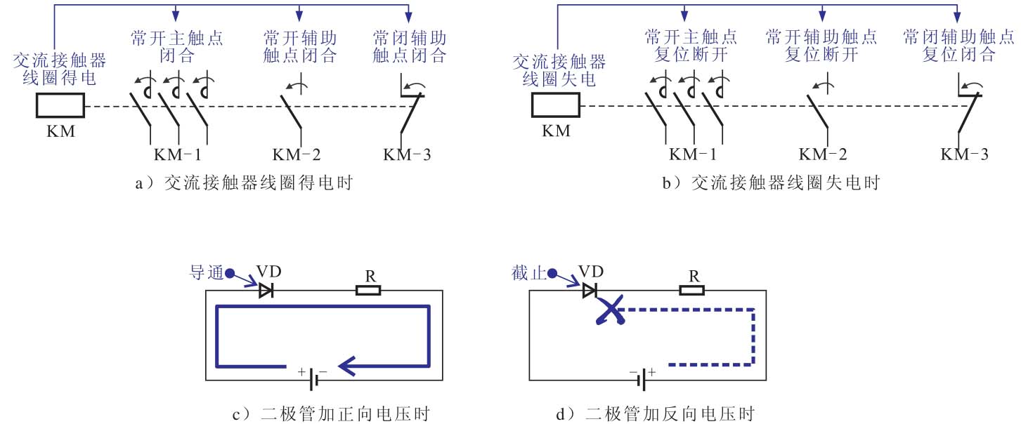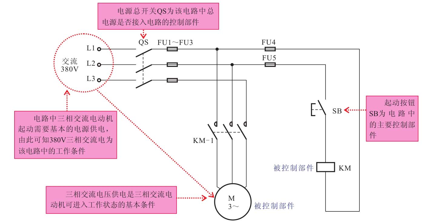 当建立好电路中各种符号与实物的对应关系后,接下来则可通过所了解器件的功能寻找电路中的工作条件,工作条件具备时,电路中的电气部件才可进入工作状态。例如图3-18所示。