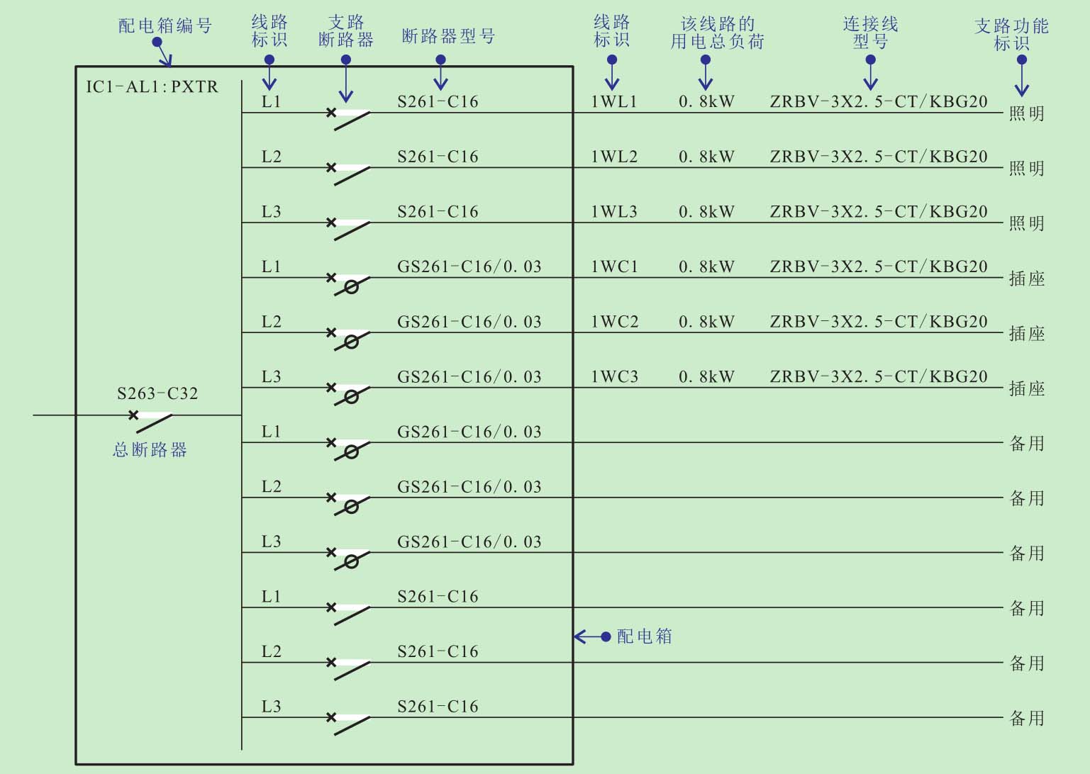 从该供配电系统的电工接线图可看出,电压经总断路器(S263-C32)分为12条支路,分别为照明支路、插座支路和备用支路,照明支路选用不带漏电保护的断路器(S261-C16),插座支路选用带有漏电保护的断路器(GS261-C16/0.03),备用支路选用不带漏电保护的断路器(S261-C16)和带有漏电保护的断路器(GS261-C16/0.03)。除此之外图中还标识出了连接线的型号为ZRBV-3 X2.5-CT/KBG20以及各支路的用电总负荷均为0.8kW。