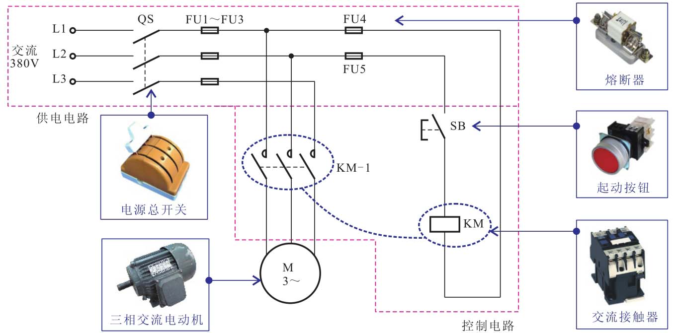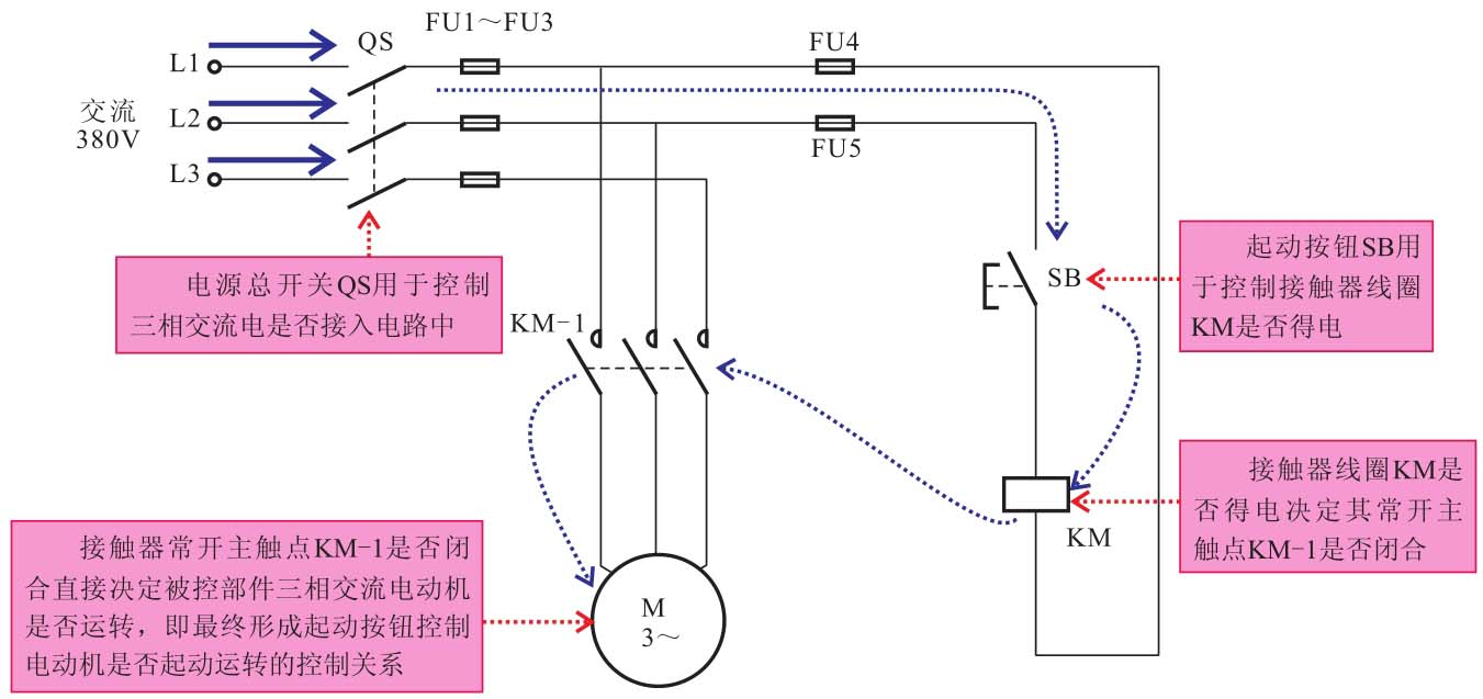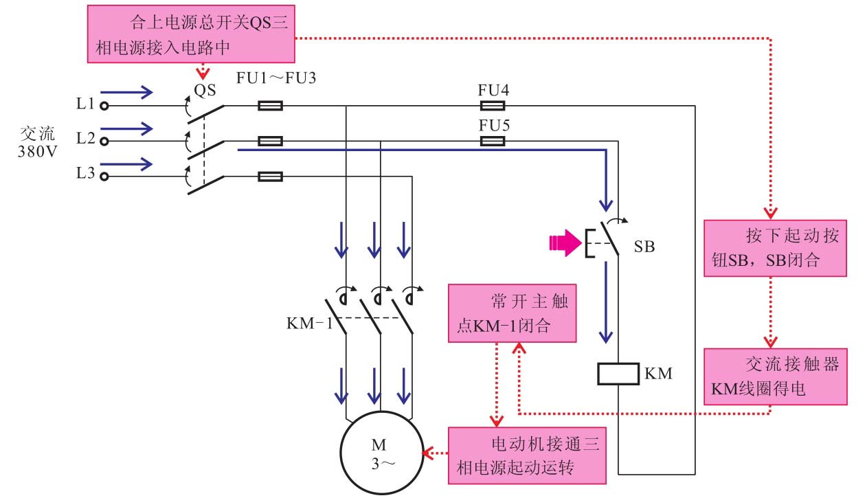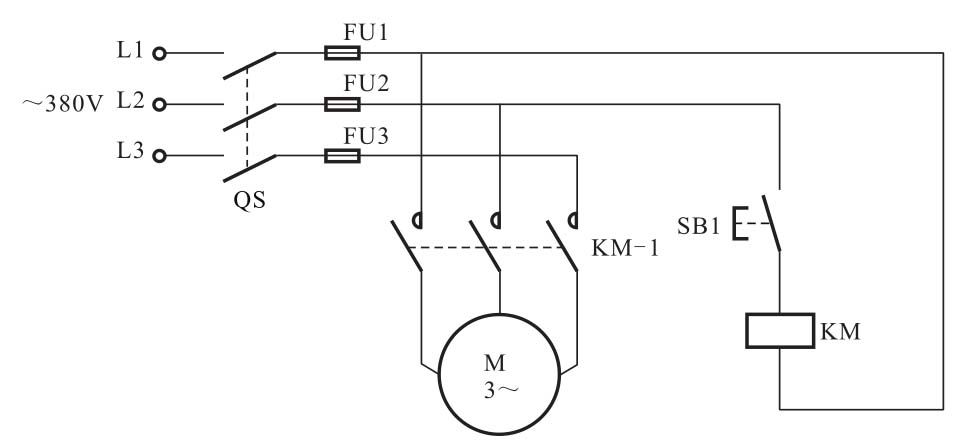 合上电源总开关QS,接通三相电源。按下起动按钮SB,SB内的常开触点闭合,电路接通,交流接触器KM线圈得电,常开主触点KM-1闭合,三相交流电动机接通三相电源起动运转。