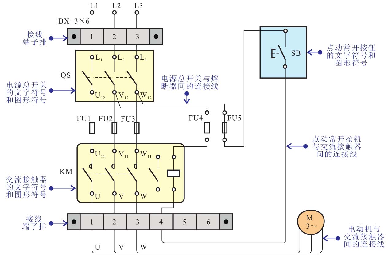电工接线图也称为电工系统图,是一种采用图形符号、线条、文字标注等元素组成的一种电路结构,主要用来表现某个单元或整个系统的基本组成、供电方式以及连接关系的电路图,图3-23为典型电动机点动控制电路的接线图。
