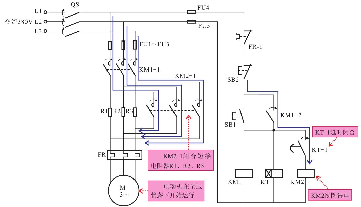 当时间继电器KT达到预定的延时时间后,其常开触点KT-1延时闭合。交流接触器KM2线圈得电,常开主触点KM2-1闭合,短接电阻器R1、R2、R3,三相交流电动机在全压状态下开始运行。