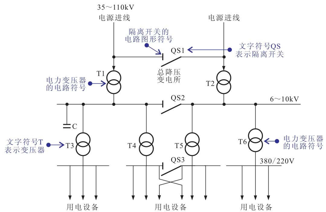 从图中可以看出,电工概略图的特点是使用文字标识和图形符号来体现系统中所使用的基本电气部件,并使用规则的导线进行连接,通过箭头方向指示供电对象。