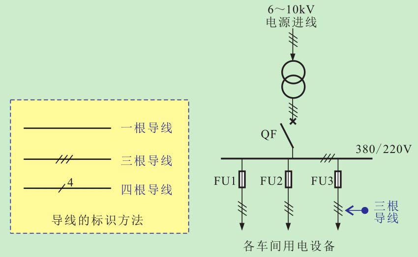 由于电工概略图是用于体现“组成”和“关系”的一种电路表达方式,因此很多时候其基本的组成元素也采用简单的画法,有部分导线中画有短划线,标识该部分导线的数量,如图3-28所示。