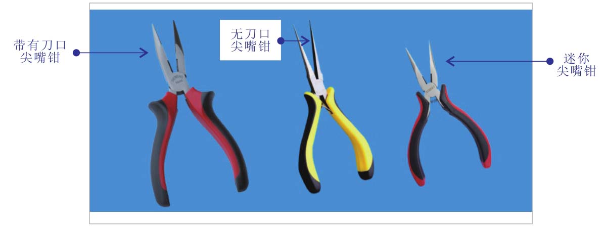 尖嘴钳的钳头部分较细,可以在较小的空间里进行操作。可以分为带有刀口型的尖嘴钳和无刀口的尖嘴钳,如图4-5所示。