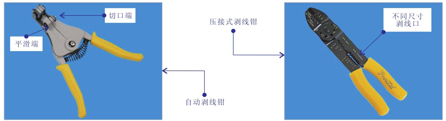 剥线钳主要是用来剥除线缆的绝缘层,在电工操作中常使用的剥线钳可以分为压接式剥线钳和自动剥线钳两种,如图4-7所示。
