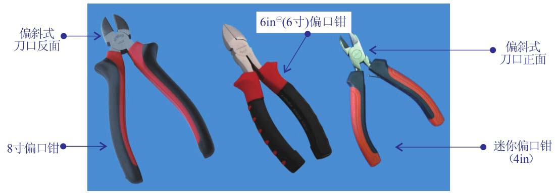 斜口钳又叫偏口钳,主要用于线缆绝缘皮的剥削或线缆的剪切操作。斜口钳的钳头部位为偏斜式的刀口,可以贴近导线或金属的根部进行切割,如图4-3所示。